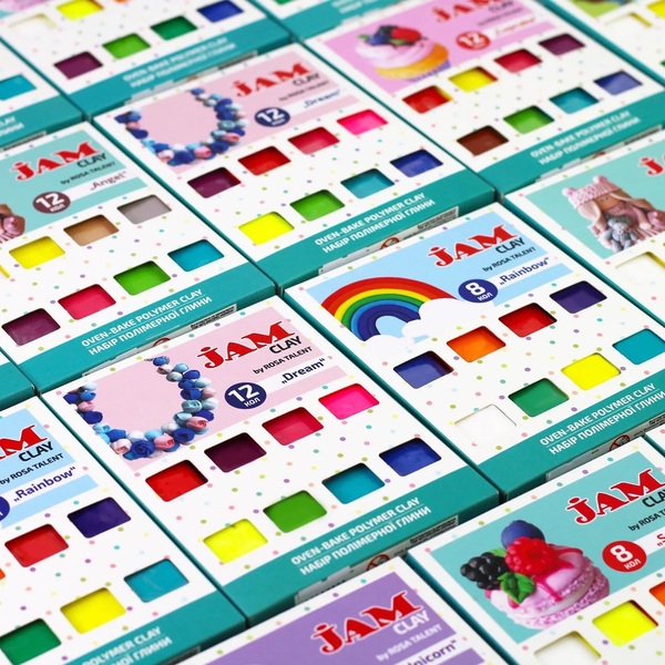 ROSA company sincerely thanks Oksana Buzhak for her collaboration, trust, and outstanding works, which adorn the packaging of polymer clay sets Jam Clay by ROSA Talent of 12 and 8 colours in various themes.